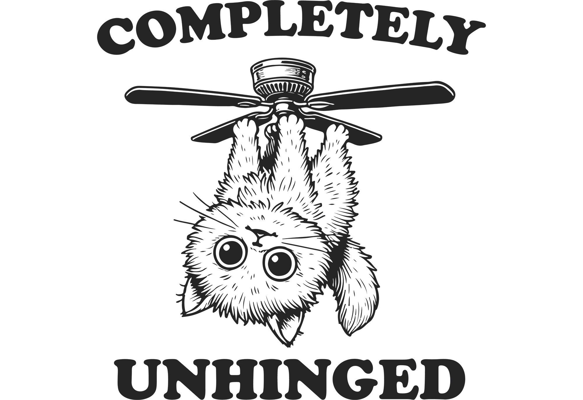 Completely Unhinged with cat hanging from ceiling fan